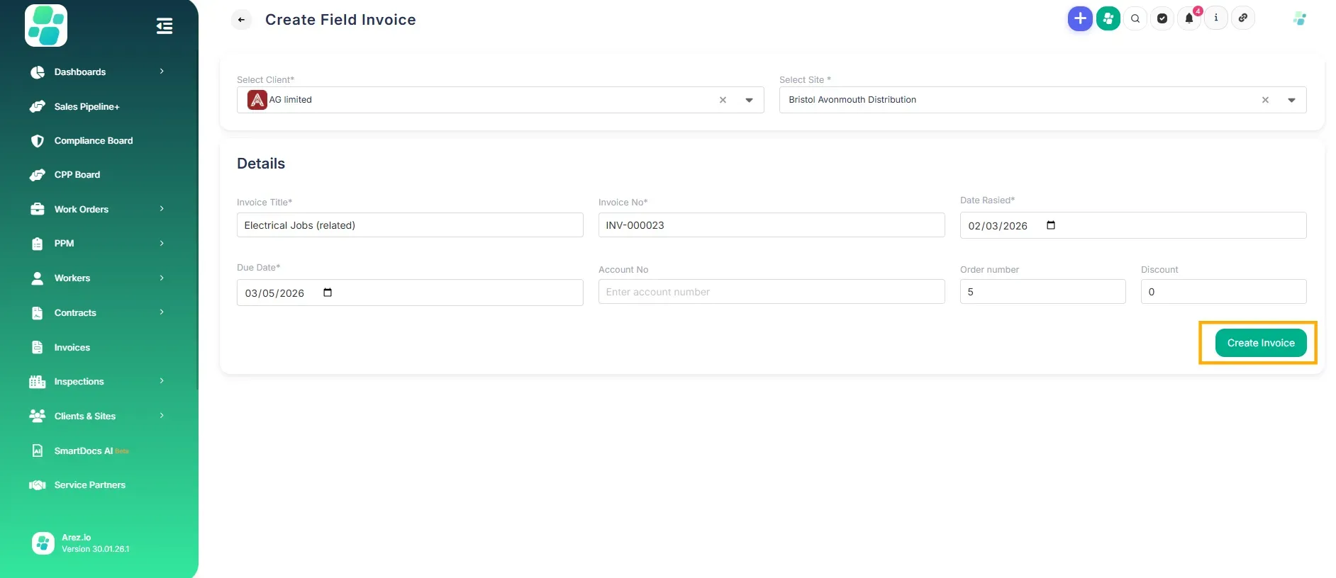 In Arez invoices are created from the Invoices list, built by adding items, updated through notes and edits, and completed by recording payments. Invoices can then be shared or printed, with all activity clearly recorded for visibility and audit.