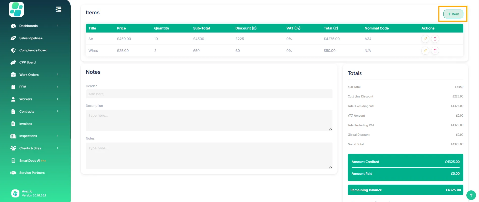 Invoice items are added directly within the invoice. Use + Item to include labour, materials or other charges, completing the mandatory fields before saving. Items appear immediately in the invoice table, where quantities, prices and tax values can be reviewed and adjusted if needed. Totals update automatically as changes are made.