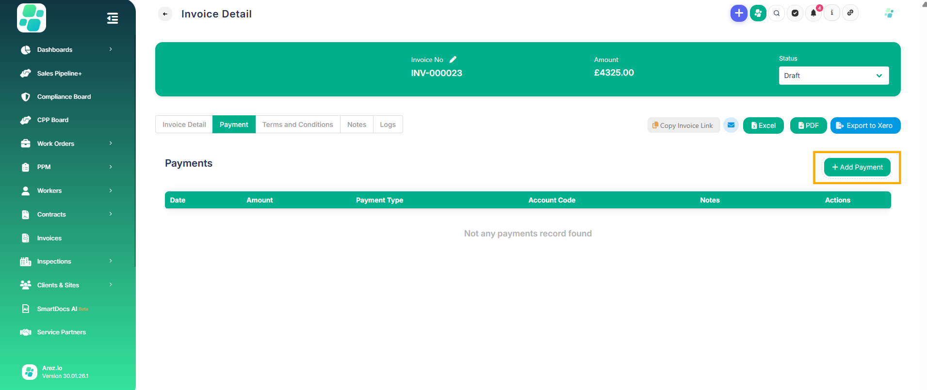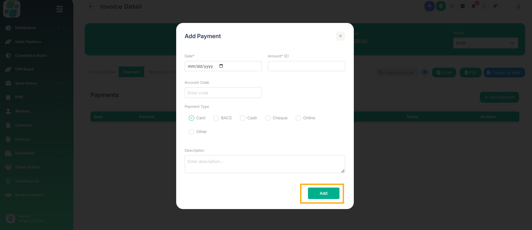 Payments are recorded from the Payments section of the invoice. Select Add Payment, enter the payment details and confirm. The invoice balance updates automatically to reflect the amount paid and any outstanding balance.