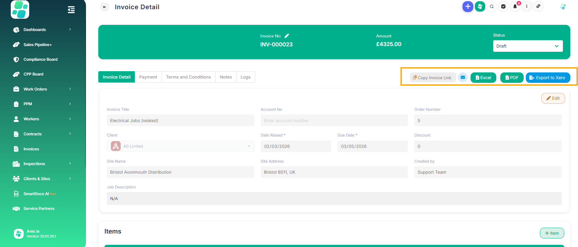 In Arez invoices are created from the Invoices list, built by adding items, updated through notes and edits, and completed by recording payments. Invoices can then be shared or printed, with all activity clearly recorded for visibility and audit.